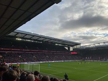 Visiting supporters are in the lower tier of the Anfield road stand (on the main stand side) where there are seats for up to 3000 fans. Views are generally good but try to avoid the seats in the back three or four rows of the lower tier as it can become very difficult to see if people in front aren't sitting down.
