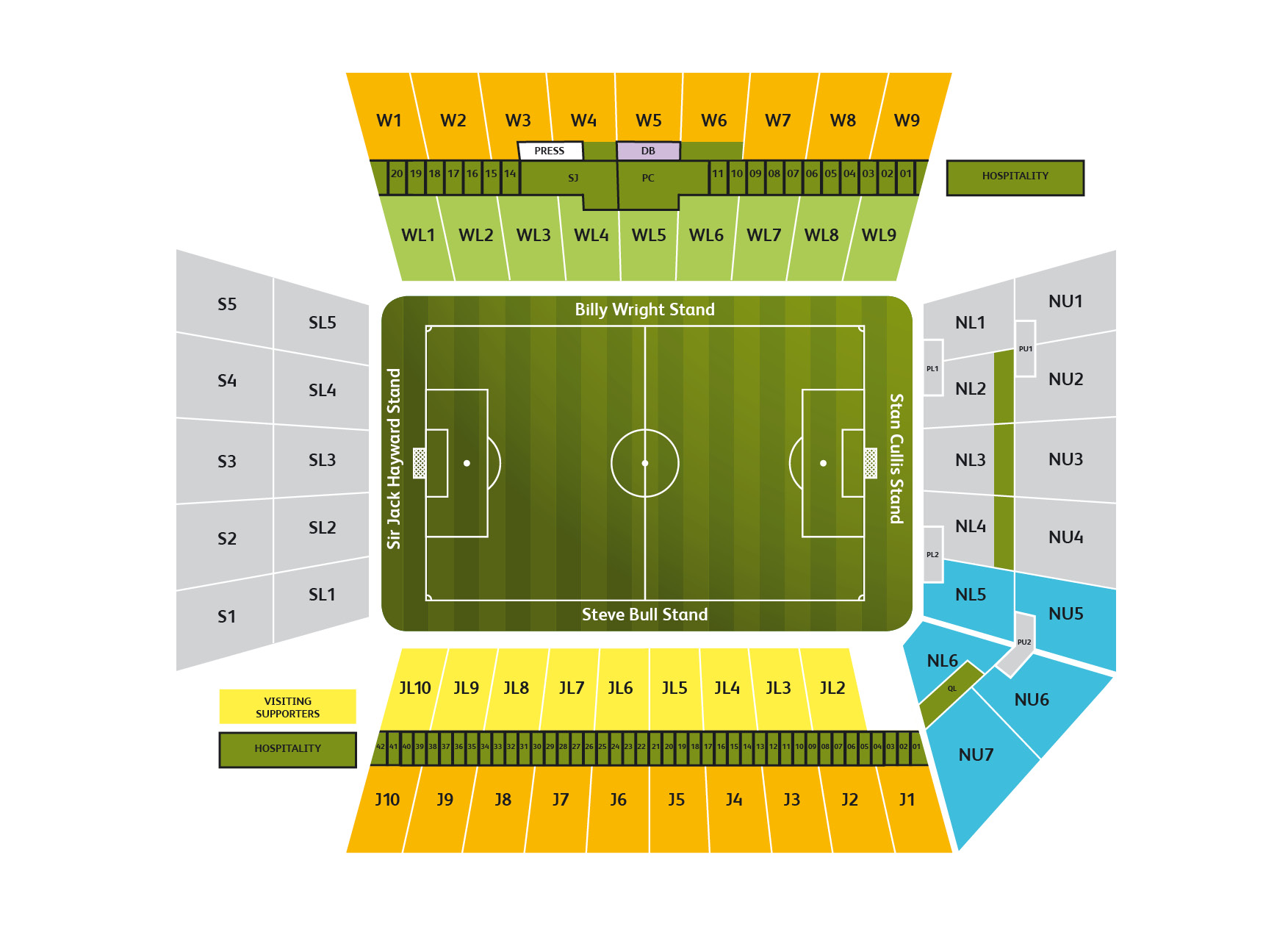 An allocation of 2,750 tickets are available to visiting supporters and are located in the upper and lower tiers of the Stan Cullis Stand at the North end of the ground. The view of the playing action is unobstructed and generally very good. Refreshments are various and not overpriced whilst facilities are very good. Much as you would expect from a new stand.