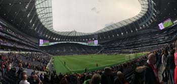Inside the stadium, you can’t help noticing its large imposing curved roof that sweeps around the ground. Although essentially a bowl design, the new Spurs stadium offers something a little different. The main West Stand on one side and the East Stand opposite, are very similar both being four-tiered. Both have a large top and lower tier, with two smaller tiers sandwiched in-between. These two smaller tiers are mostly for corporate hospitality areas. Above the tiered areas below the roof, there is a glassed fronted area running along the length of the stands.